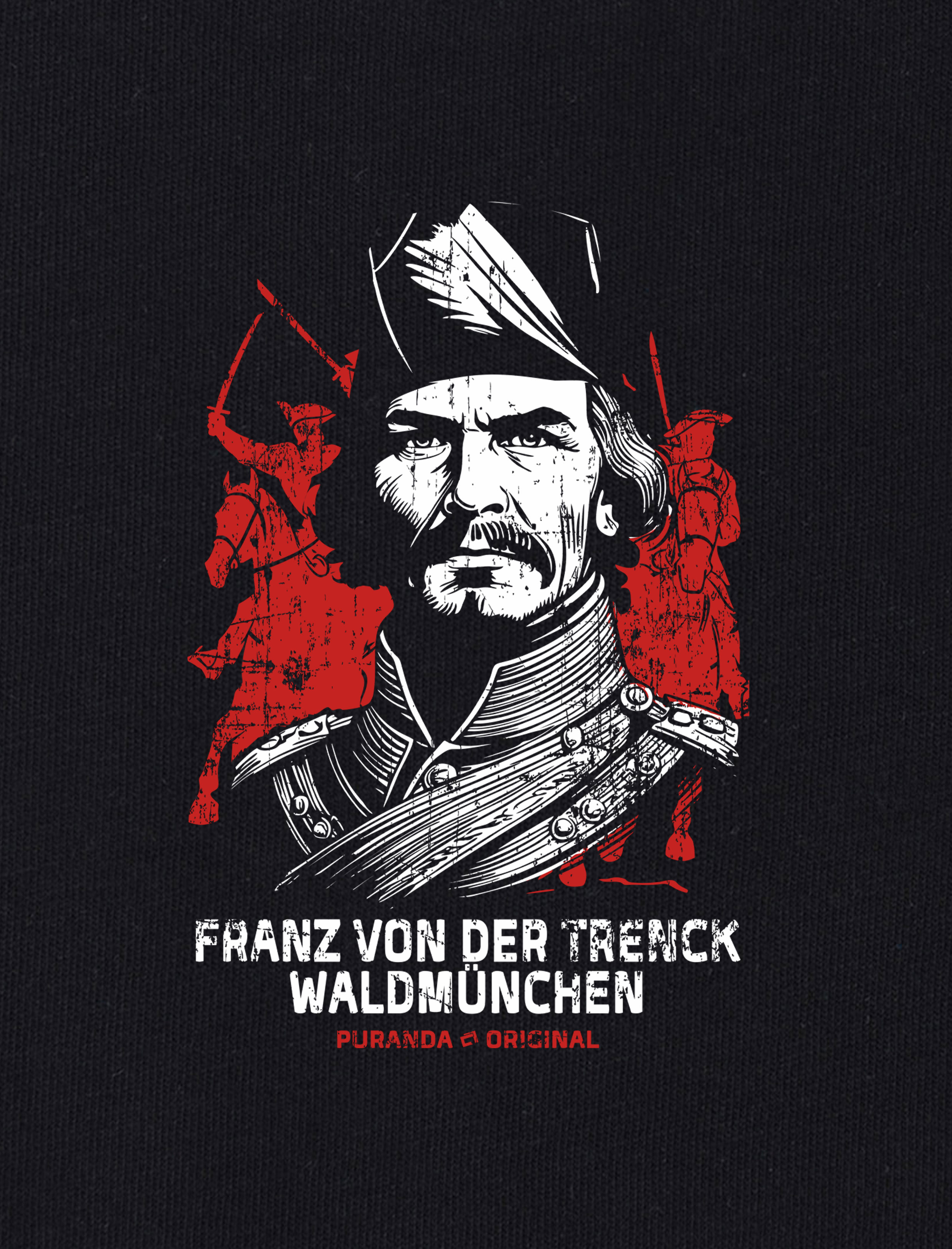 Entdecke das einzigartige "Franz von der Trenck" T-Shirt aus unserer exklusiven Kollektion. Dieses Shirt zeigt den ikonischen Kopf von Franz von der Trenck - einem rebellischen Helden und Abenteuerer -unterstützt von den wilden Panduren auf ihren Pferden im Hintergrund.
